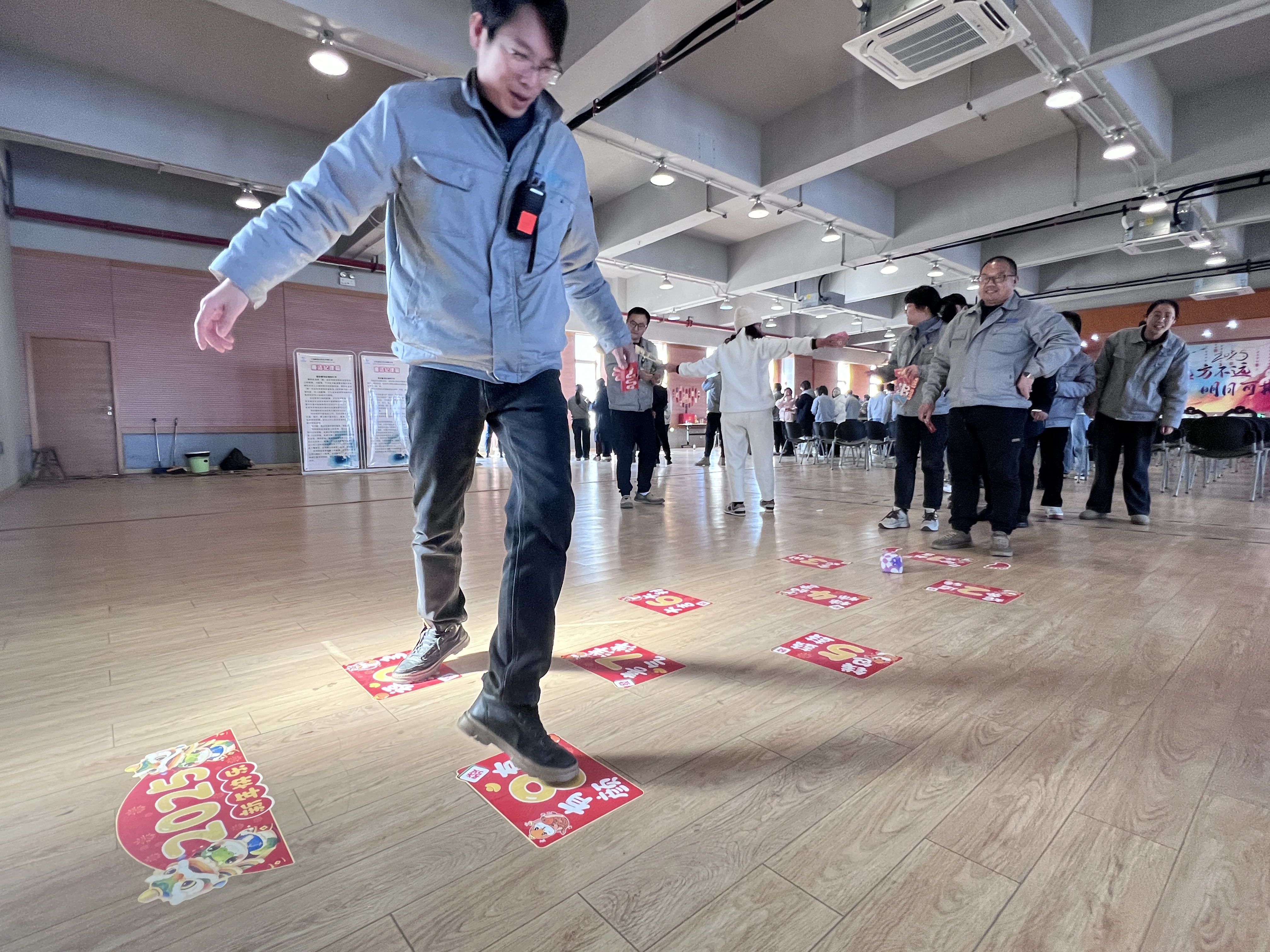 接下来便是欢乐的迎新喜乐游园环节,本次活动设有金蛇投壶、智驭灵蛇、珠圆玉润、金蛇衔福、速度接龙、蛇转乾坤、踢毽挑战七大关卡。场地布置得年味十足,气球点缀、灯笼高挂、灯联闪烁,春意盎然,各个摊主的裁判早已提前准备就绪。员工们签到领取集章卡后立即开启了闯关模式,自由组合穿梭于各关卡之间,即兴发挥,大展身手,感受游戏魅力。在智驭灵蛇关卡,3名队员配合默契用蒲扇将气球赶至指定点;在踢毽挑战关卡,更有单踢、双踢高手齐聚,看着灵巧的毽子在脚尖上下飞舞,宛如金蛇在飞腾;在金蛇衔福关卡,大家更是跃跃欲试,跳的不仅仅是房子,更是一份儿时的回忆;在许愿环节,大家纷纷将写满心愿的卡片挂上许愿树,寄托对新一年的美好期许,寓意幸福吉祥、心想事成。最后的盲盒抽奖更是将活动气氛推向高潮,大家满载奖品与欢乐而归,在轻松愉快的氛围中洗去一年的辛劳,为新的一年注入满满活力。