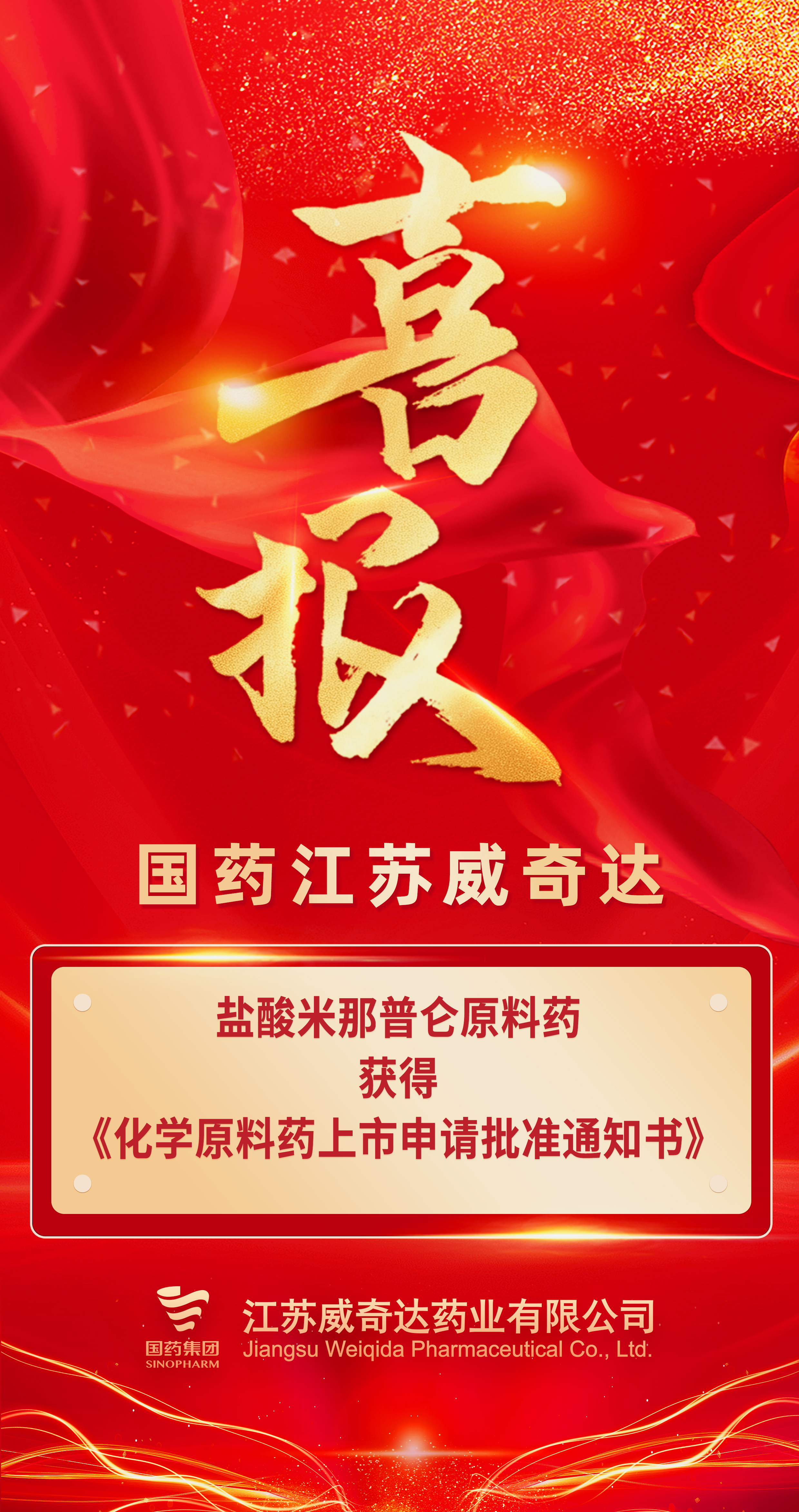国药江苏威奇达收到国家药品监督管理局核准签发的《化学原料药上市申请批准通知书》,批准盐酸米那普仑原料药上市申请,是公司深耕特色原料药领域的阶段性成果。