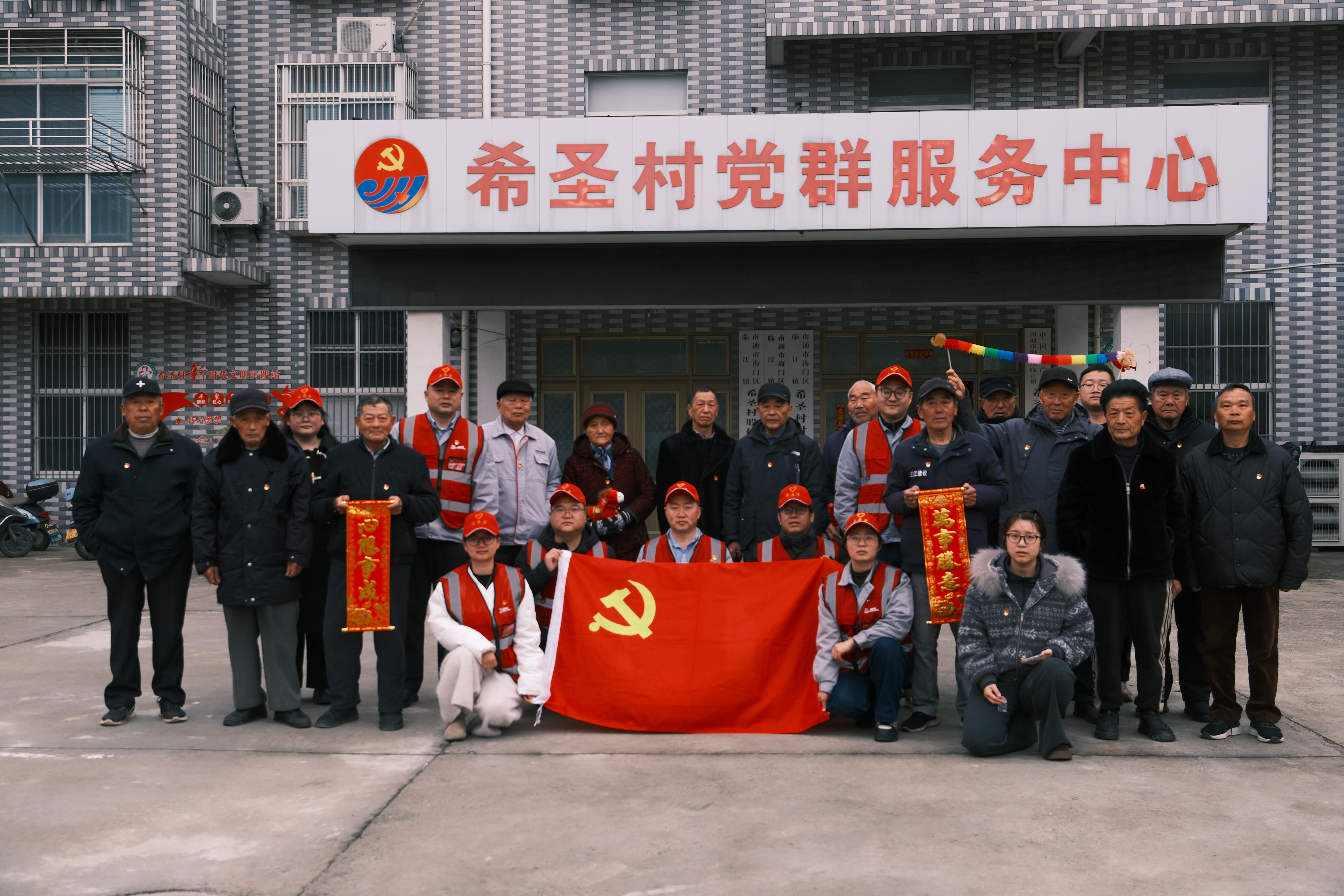 活动当天,希圣村党群服务中心暖意盎然,红灯笼、中国结等节日装饰错落有致,浓厚的元宵氛围扑面而来。志愿者提前规划拍摄流程、精心准备拍摄道具,布置拍摄场景。红色幕布前,志愿者们组织老党员们有序排队、调整姿势。